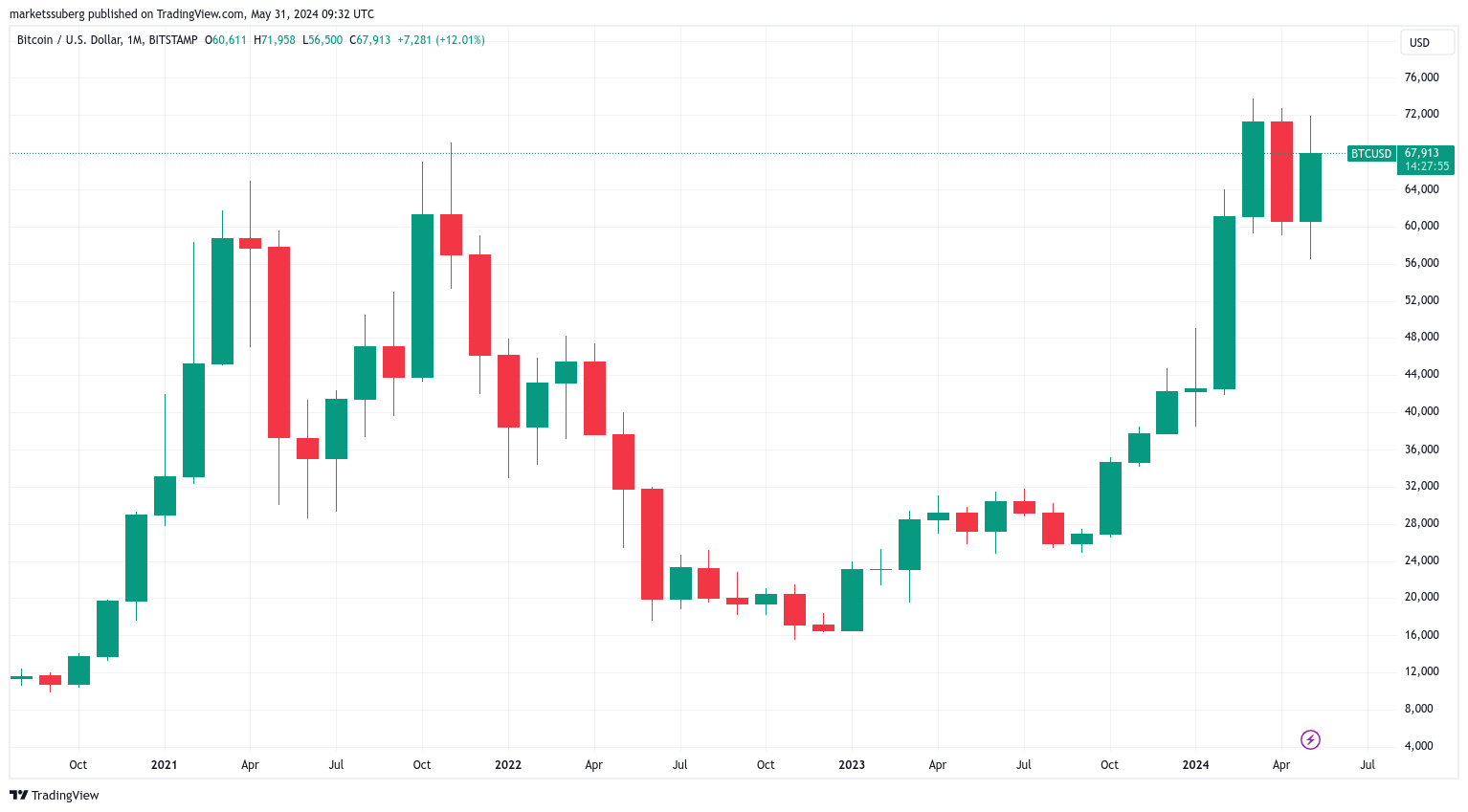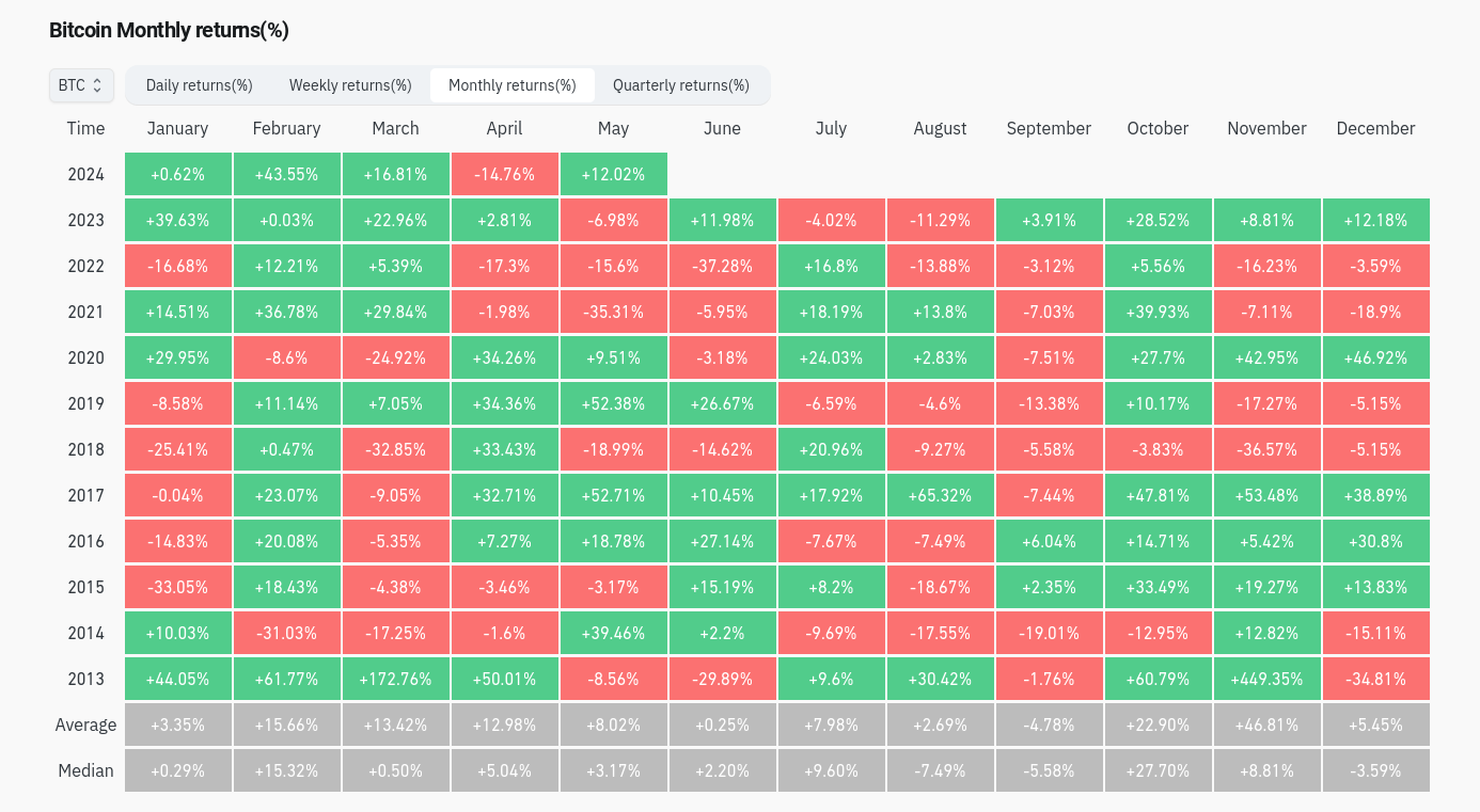 12 Mayıs 2024, Bitcoin için 2019’dan bu yana en başarılı yılın beşinci ayı olacak.