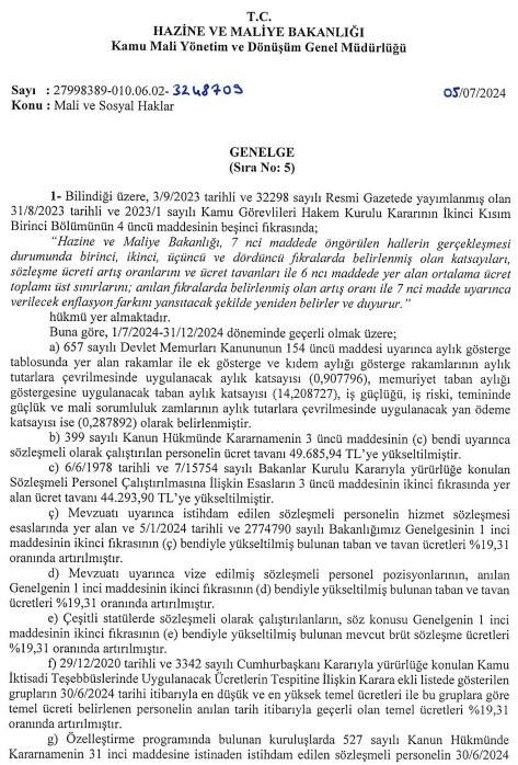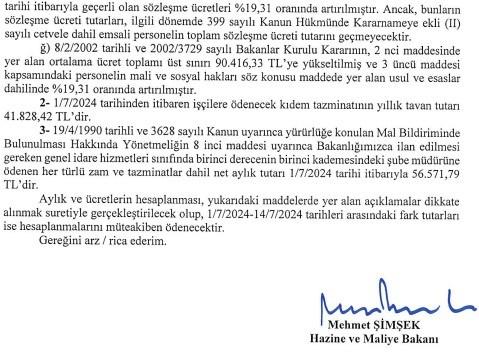 Hazine ve Maliye Bakanı Mehmet Şimşek, sözleşmeli personel, memur ve emekli memurlara yönelik zam, kıdem tazminatı tavanı ve maaş farklarının hesaplanmasına ilişkin kararı imzaladı.