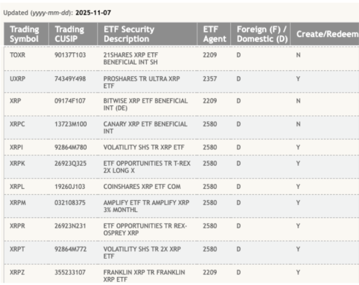Pazartesiden itibaren DTCC’deki XRP ürünlerinin listesi. Kaynak: DTCC