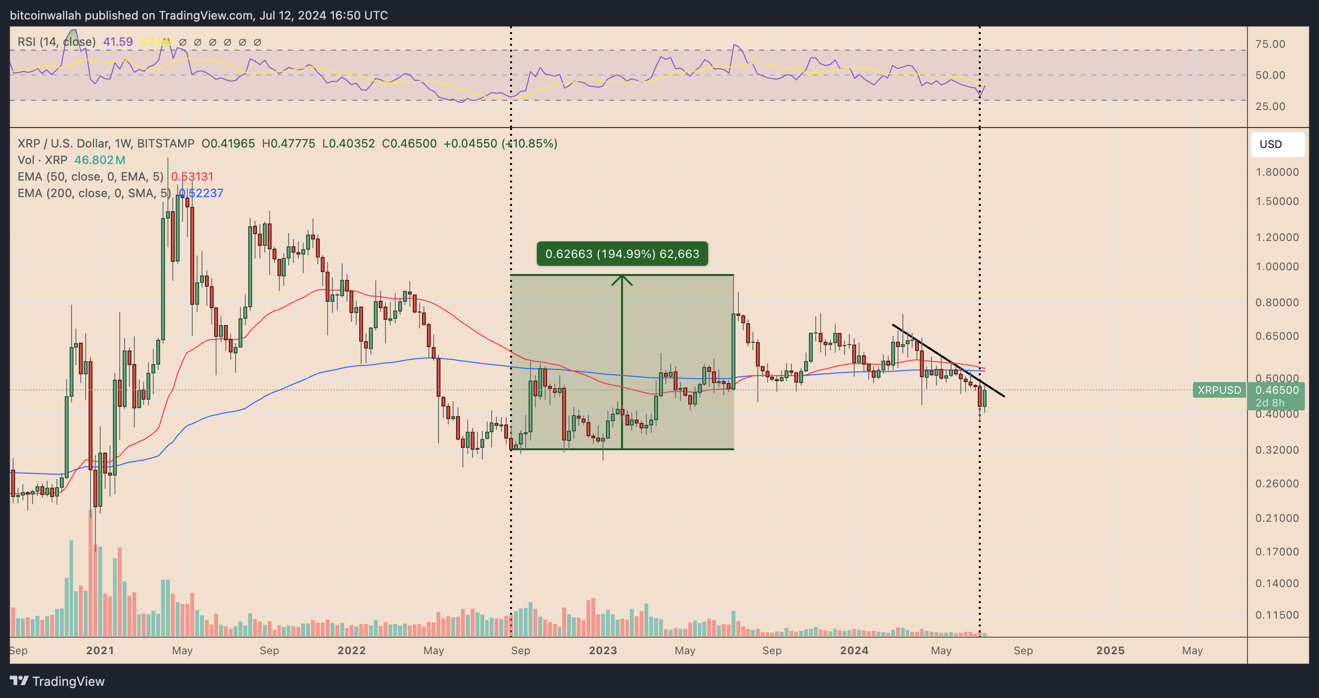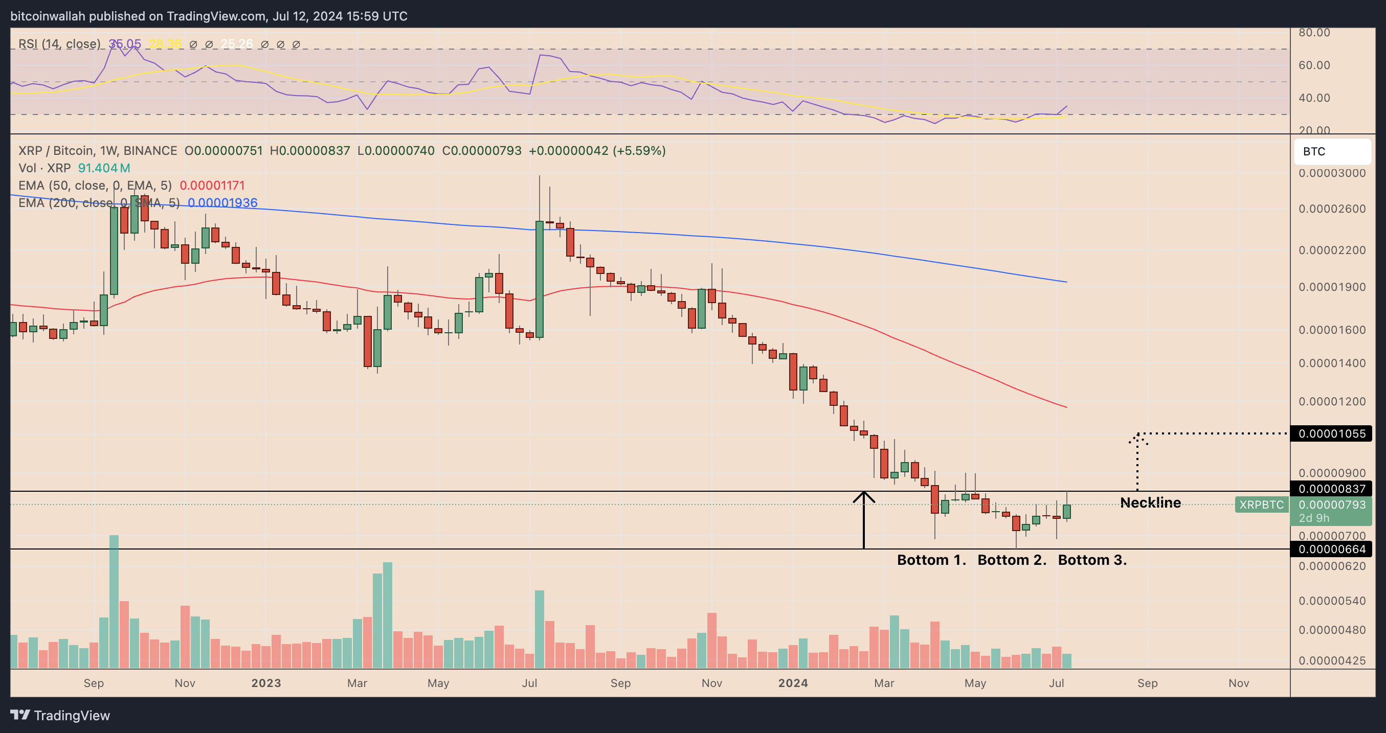 12 Temmuz itibarıyla XRP/BTC çifti, potansiyel bir kırılma için 793 satoshi (1 satoshi = 0,00000001 BTC) yakınındaki boyun çizgisi desteğini test ediyordu.