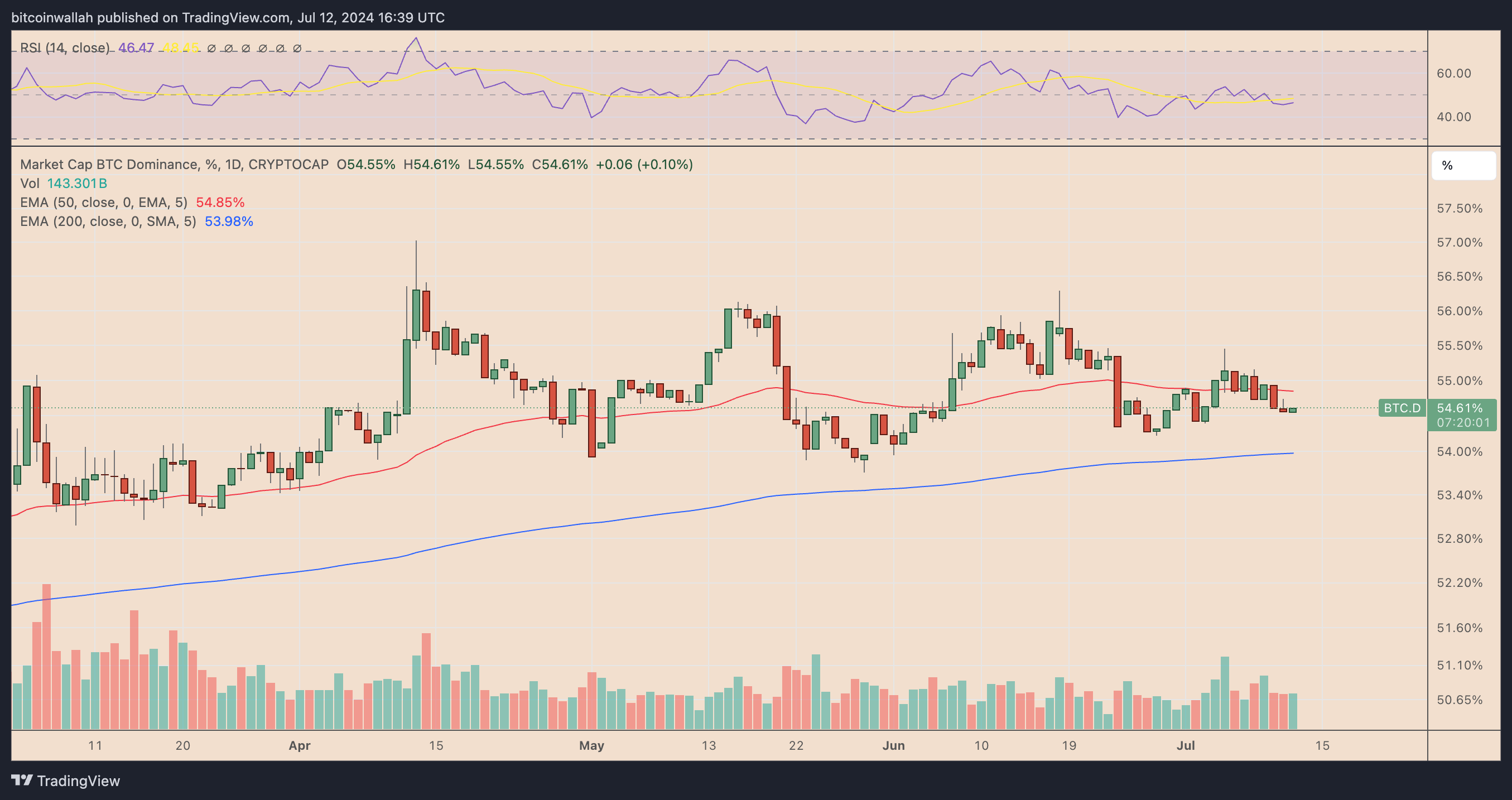 Bitcoin hakimiyeti, bir hafta önceki %55,46’lık yüksek seviyeden 12 Temmuz’da %54,55’e düştü; bu, BTC fiyatlarındaki dalgalanma devam ettikçe yatırımcıların altcoinlere yönelebileceğini gösteriyor.