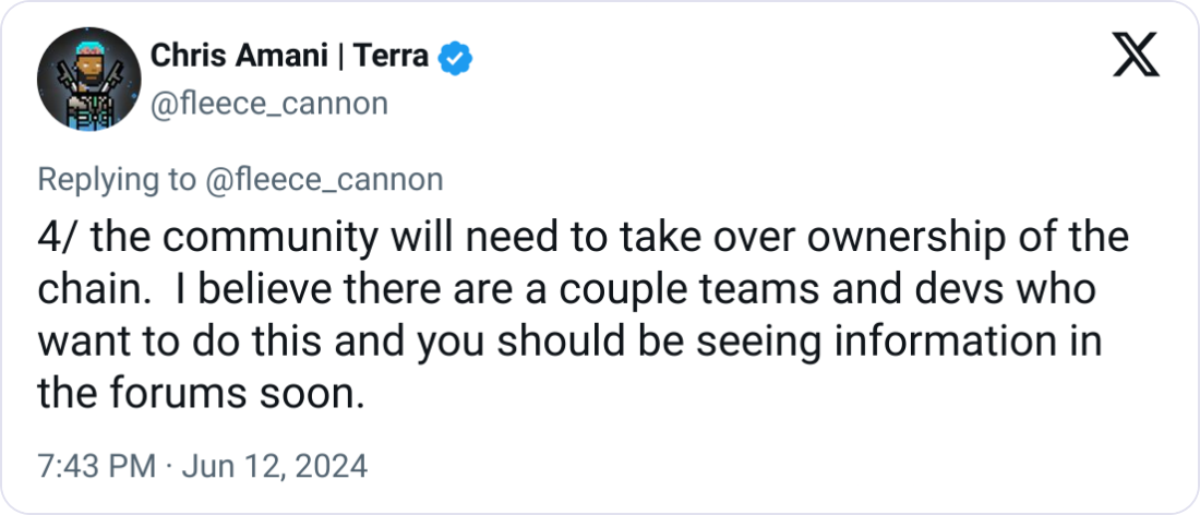 Amani ayrıca, kalan kazanılan tokenleri yakmaya yönelik bir topluluk teklifi planlarını ve Terra ve Terra Classic (LUNC) blok zincirlerinin topluluk liderliğindeki yönetişim ihtiyacını da vurguladı.