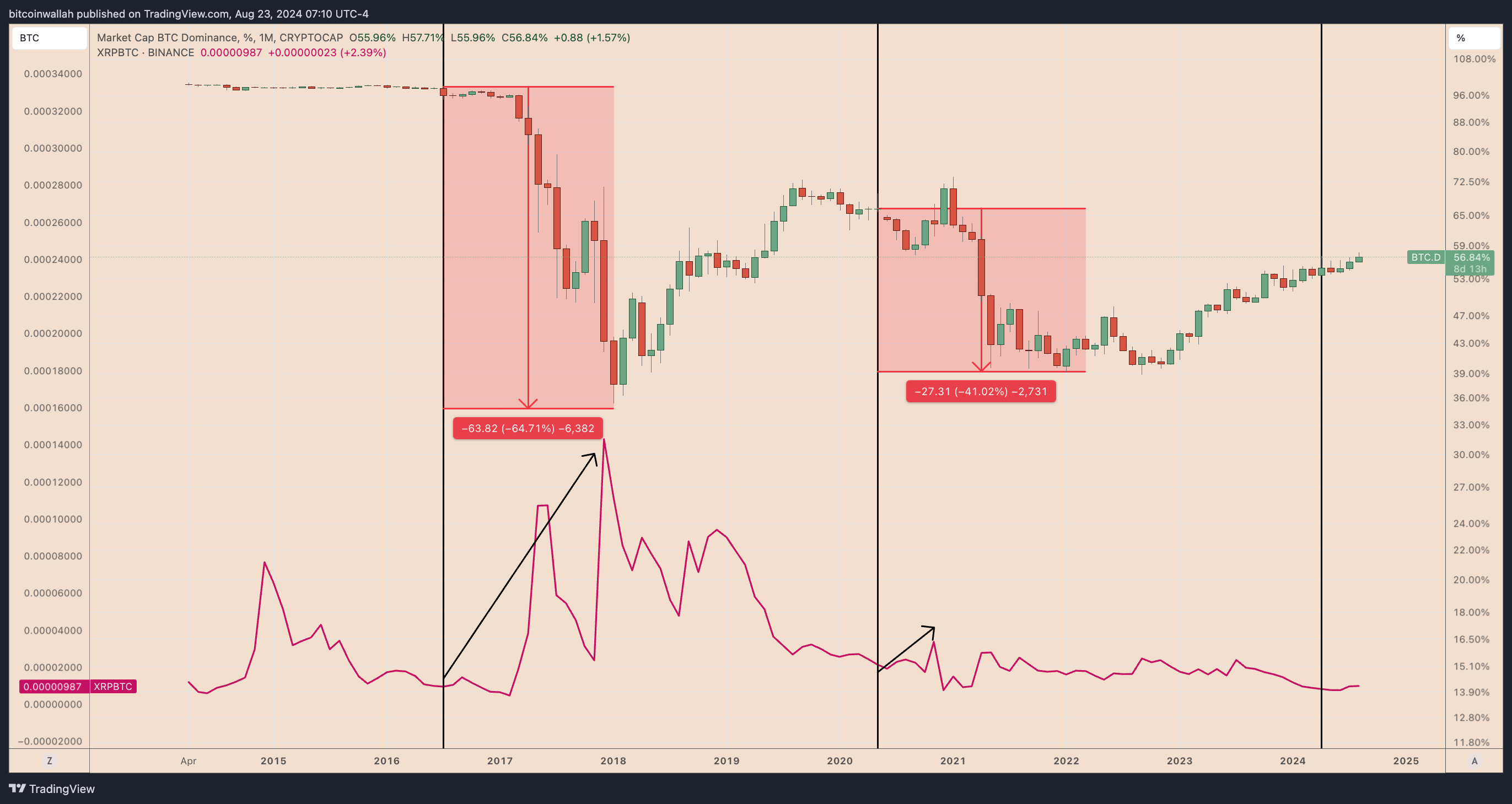 Ağustos 2024’te SEC ile Ripple arasındaki dava sonuçlandı ve Ripple, XRP’yi kurumsal yatırımcılara yasadışı olarak sattığı için 125 milyon dolar para cezası ödemeye karar verdi. Karardan bu yana, XRP/BTC yaklaşık %15 arttı ve özellikle Bitcoin’in hakimiyeti, Nisan 2024’teki son yarılanmanın ardından (altcoin açısından) yarılanma sonrası tipik düşüşü takip ederse, rallinin bugün de devam ettiğini görebiliriz.